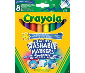 Crayola Ultra Clean Washable MarkersSet of 8 MarkersMore washable, now washable from skin, clothing and painted wallsOur brightest, truest colours yetBroad line markers allows kids to draw or colour with thick lines