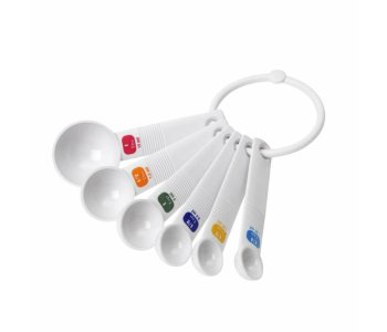 This set of 6 colourful plastic measuring spoons are especially handy, attached to a swing tag.