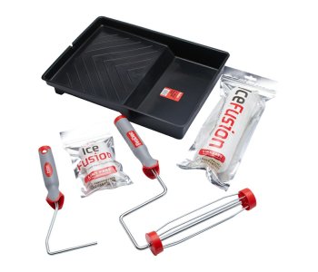 Comprising 9" and 4" rollers, plus frames and tray, this 6 piece set features Ice Fusion fabric which is made from an advanced blend of polymers to give excellent loading, release and a top quality ultra-smooth finish that is the closest to a spray finish you can achieve with a roller. The key feature is ProDec's exclusive Fused Fibre Technology: the fibres are interwoven together, which increases their strength and makes the fabric lint-free so Ice Fusion can be used straight from the packaging without pre-washing. Fused Fibre Technology makes the fibres semi-elastic: during use they bounce back into shape after they've been pressed against the surface, so each stroke gives exactly the same finish quality as the last, right up to the end of the job. The medium pile is suitable for emulsion paints on smooth and semi-smooth surfaces and the rollers come in handy airtight clip close bags, enabling wet rollers to be conveniently stored overnight. Both the durable, screw fit cage roller frame and the mini frame have soft grip handles for comfortable working, and the paint tray is made from 100% recycled plastic.